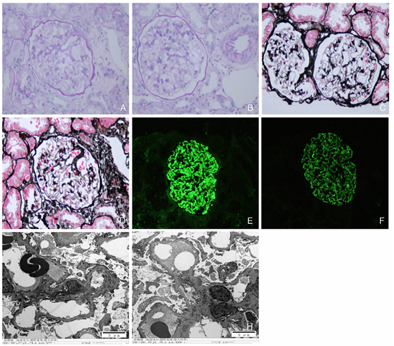 注:A、B:PAS染色显示肾小球未见新月体,系膜细胞未见明显增殖,系膜区无增宽,内皮细胞未见明显增殖,毛细血管裆开放良好;C、D:PAM染色显示肾小球基底膜稍增厚,上皮下可见少量嗜复红物质沉积。未见钉突及双轨;E、F:免疫荧光显示IgG (+2)、C3(+)、IgG1(+)、IgG4(+)沿毛细血管祥颗粒样沉积;G、H:电镜观察显示基底膜稍有增厚,足突细胞节段融合,上皮下见电子致密物沉积