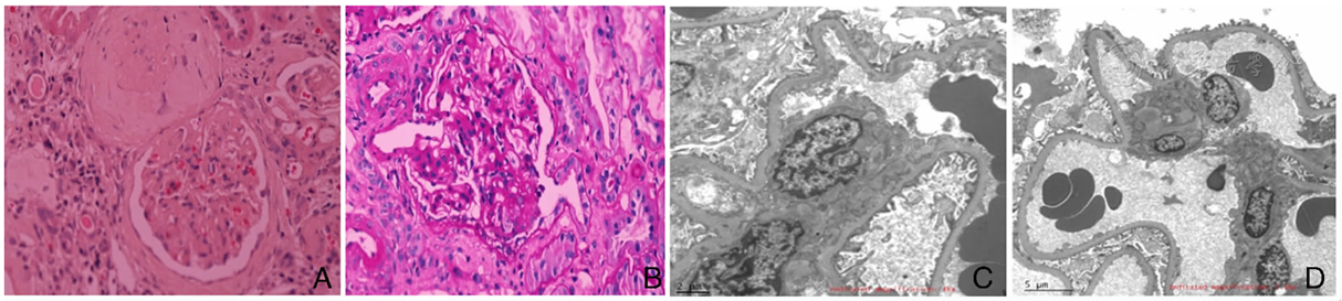 注:A:肾小球球性硬化(苏木精-伊红染色×400);B:肾小球节段性硬化,节段性硬化区域位于尿极处伴周边脏层细胞肥大(过碘酸-雪夫染色×400);C:系膜细胞和基质轻度增生,肾小球各部位未见确切电子致密物沉积(电镜×4 000);D:肾小球足细胞足突大部分融合(电镜×2 500)